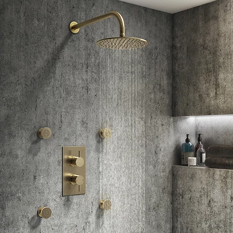 The on-trend Arezzo brushed brass round range brings substantial elegance to the modern bathroom. Package includes a concealed thermostatic shower valve with diverter, fixed shower head and 4 round body jets. The shower valve offers thermostatic showering via two easy-to-operate controls for temperature and flow, integrated diverter switches the water between two shower accessories (overhead shower head or body jets). The ideal solution for multi-option showering.