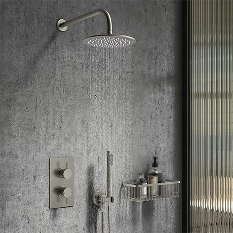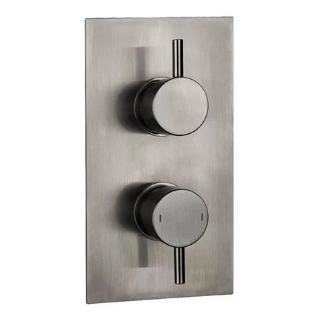 The Arezzo round concealed thermostatic shower valve with built-in diverter features a quality brushed gunmetal grey finish with a striking modern round design, perfect for creating an eye catching look in your bathroom. Offers thermostatic showering via two easy-to-operate controls for temperature and flow. Valve has built-in diverter so you can switch easily between the overhead rainfall effect and the handset.