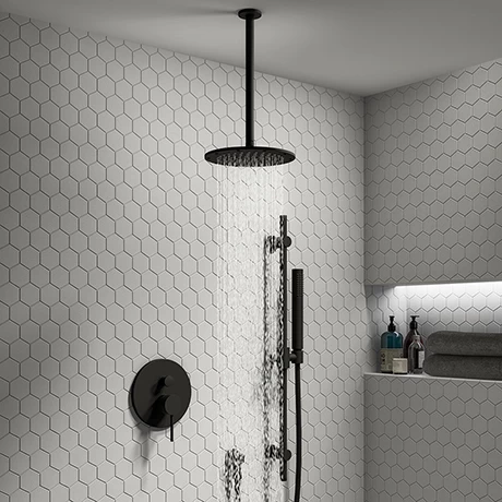 The Arezzo modern matt black single lever concealed manual shower valve with diverter, characterised by its stylish round handle which controls temperature and flow. Simply lift lever to introduce flow, adjust left or right to set temperature.