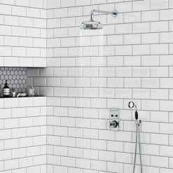 A traditional Burlington Bath shower mixer with Wall mounting unions, Extended vertical riser, Straight shower arm for vertical riser mounting, 6″ rose and Birkenhead tap handles. Create a stunning period bathroom in your home with the luxury Burlington tap and shower range. Designed for showering over a bath.