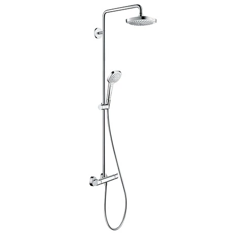 The Croma Select E Showerpipe 180 Thermostatic Shower Mixer combines a hand and overhead shower, as well as a thermostat, into one product. It features a swivelling 180mm shower head and shower handset with a height-adjustable shower holder that can also be turned and tilted. The self-locking slider can be operated with one hand. The head shower has two revitalising spray patterns while the hand shower features a Select button to comfortably switch between the three spray modes. The QuickClean rub clean nubs loosens any limescale deposits making sure your hand shower looks beautiful, and stays working for longer.
