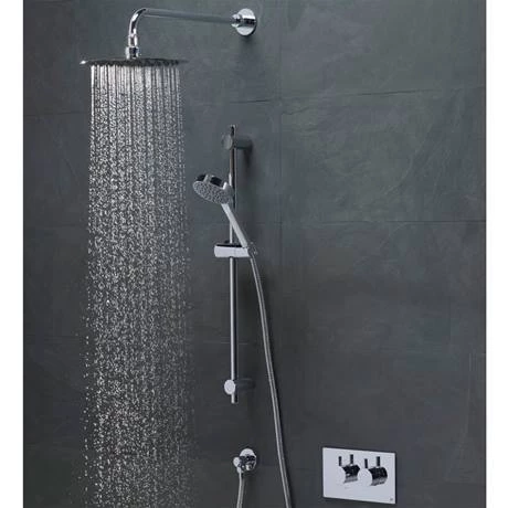 Roper Rhodes collection of concealed all-in-one shower systems offer a luxurious showering experience combined with good looks. The Event Round Concealed Dual Function Shower System features an automatic shut down if the cold water pressure should suddenly fail and is limescale resistant. The package consists of a two way diverter thermostatic shower valve, 460mm length adjustable fixed arm, 250mm stainless steel shower head, Wave adjustable riser rail, single function shower handset and a brass shower hose & wall elbow.